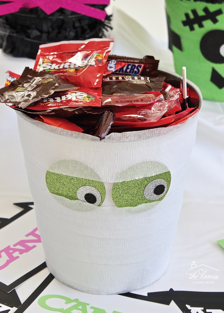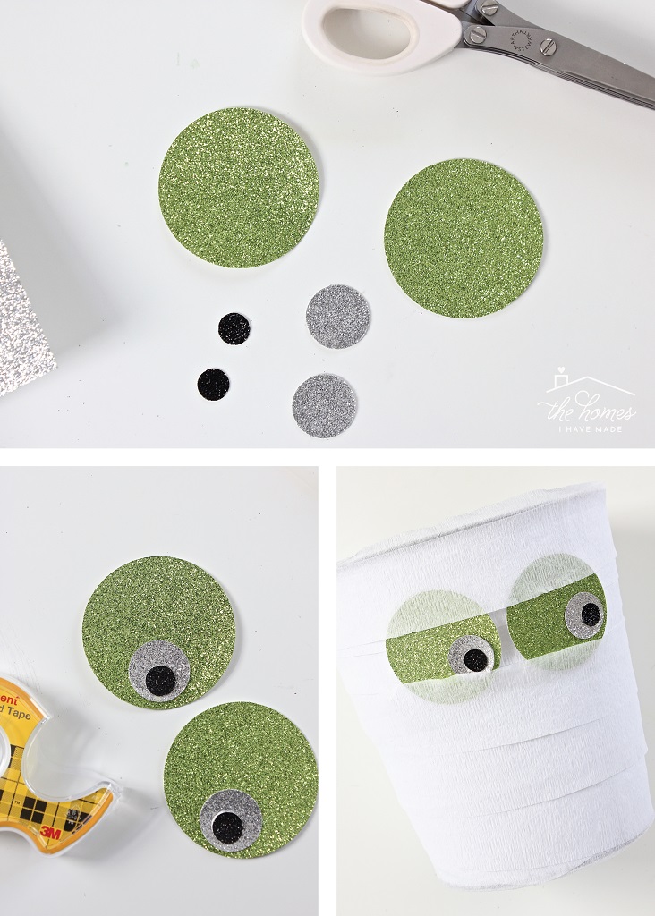 Cut three different sizes of circles from three different colors of cardstock. Layer the circles onto each other with double-stick tape and then nestle them into the streamers to create the Mummy’s eyes. If necessary, use more double-stick tape to hold the eyes in place. Finish by filling the bucket with candy!