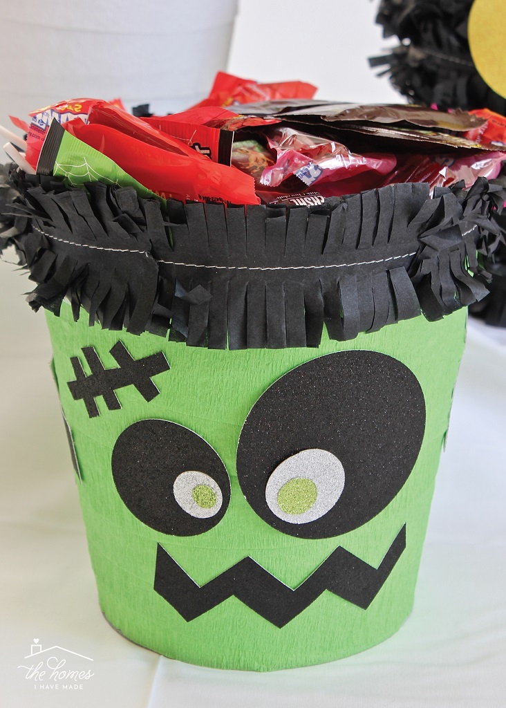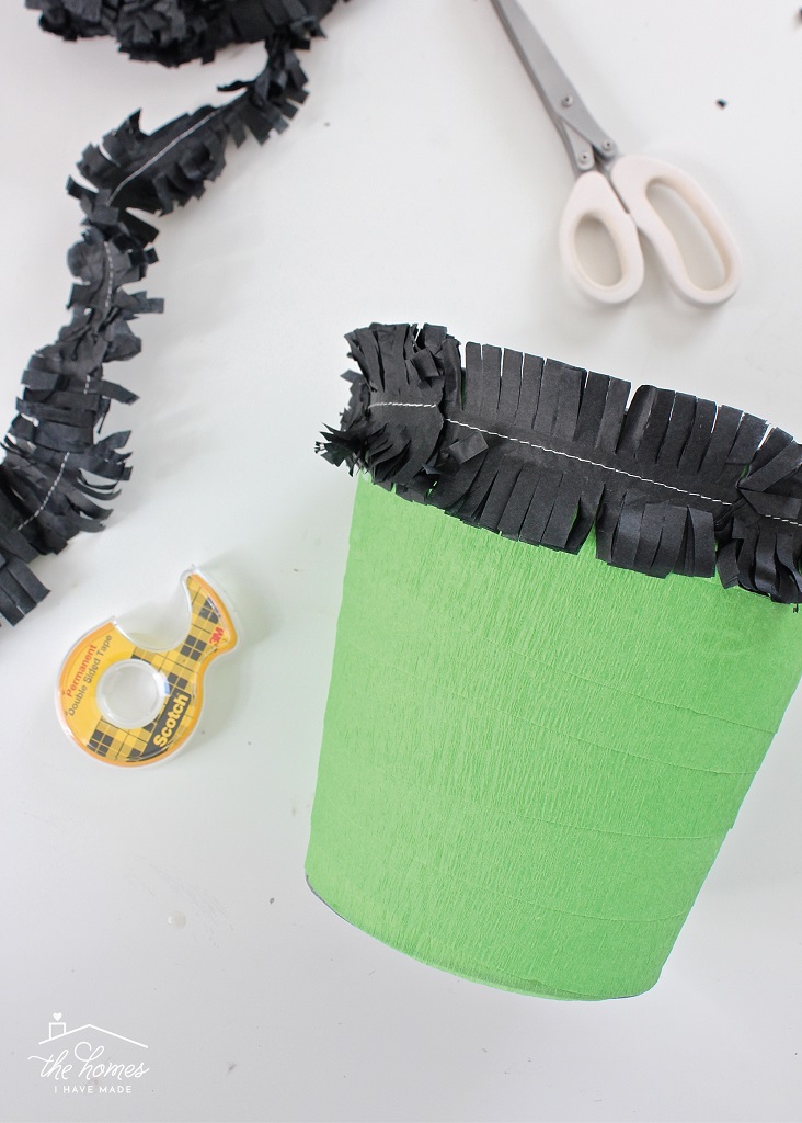 Although he looks a bit more involved, the Frankenstein Treat Bucket comes together in a very similar fashion. Start by wrapping the bucket in green crepe streamers, overlapping as you work down the bucket and using double-sided tape, as necessary, to keep the paper in place.