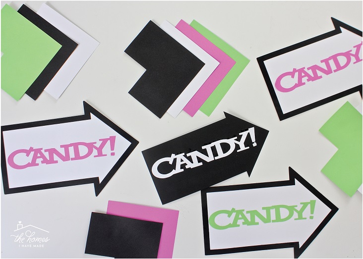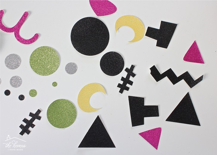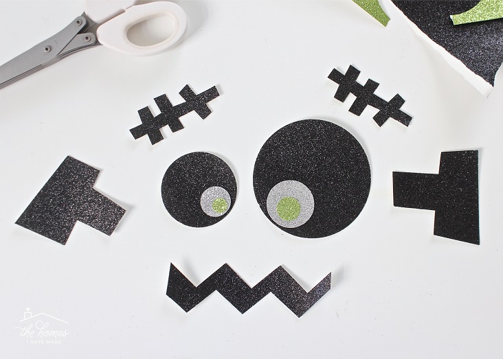 From black glitter cardstock, cut out a variety of shapes to make Frankenstein’s face, including two eyes (with layers if desired), a mouth, eyebrows and bolt-like ears.