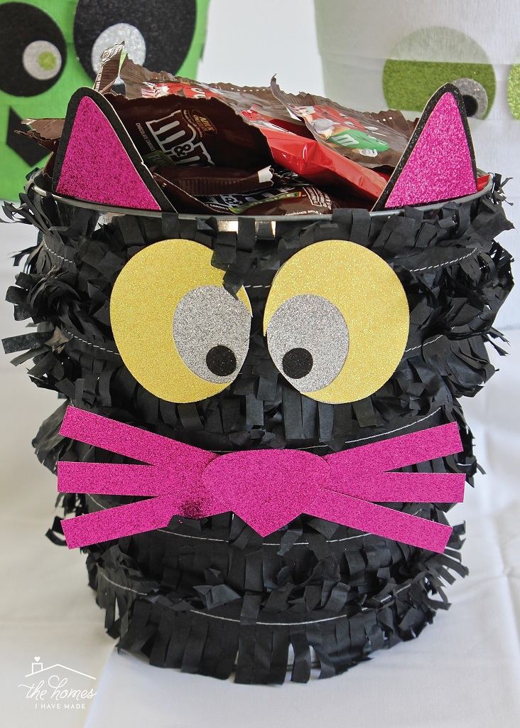 The Scaredy Cat Treat Bucket comes together slightly differently. Instead of wrapping the fringe streamers around the bucket in a random fashion, cut lengths of streamers that will fit just right around the bucket and tape each one in place individually.