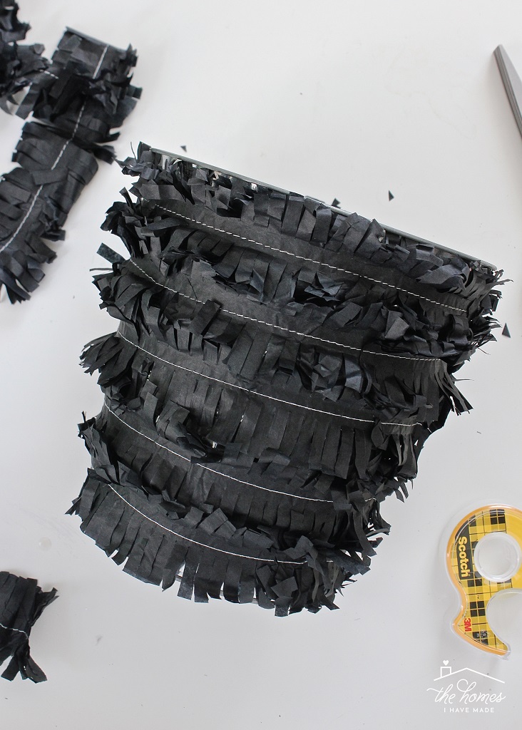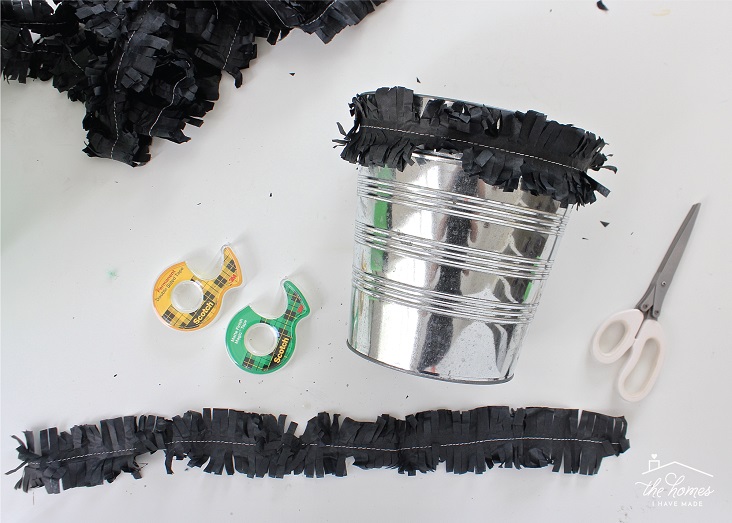 Cut a length of black fringe streamers (or make your own as shown earlier) to fit around the top of the bucket; secure in place with more double-stick tape.