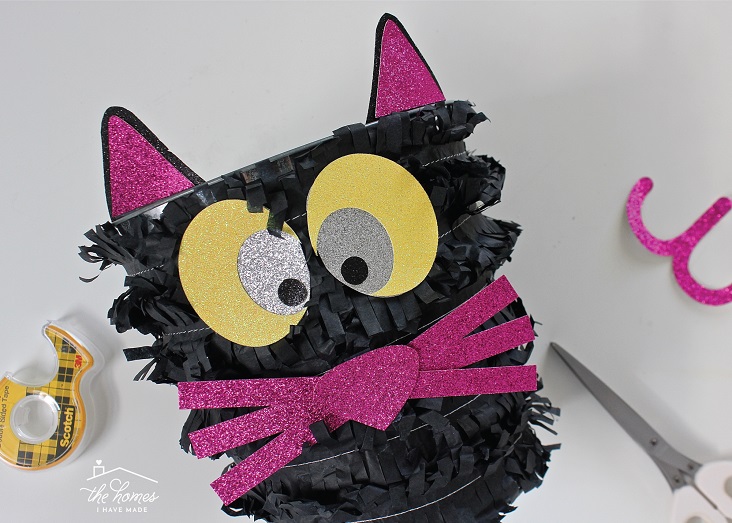 With the fringe in place, secure the cat face elements on top using more double-stick tape. Finish by filling the bucket with candy!