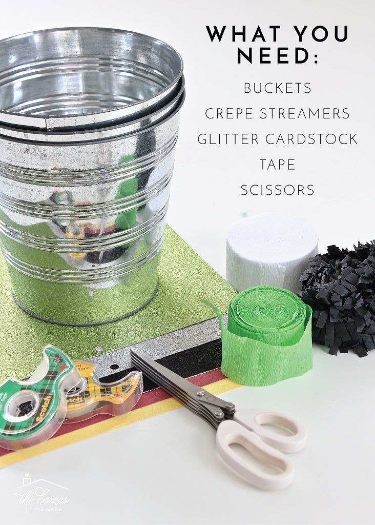 These adorable DIY Treat Buckets require mere minutes and no craft skills! If you look closely, you’ll see they are made with crepe paper streamers and some sparkly cardstock cut into various shapes. If you can use tape and scissors, you can do this project!