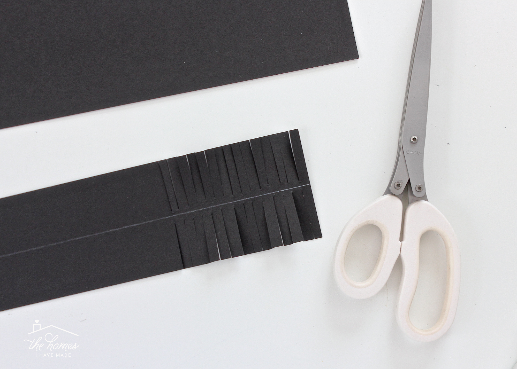 However, if you can’t find the black fringe streamers, you can recreate the look using strips of black cardstock. Cut cardstock into 2.5” wide strips, and then make slits toward the center of each strip as shown below. It will take a little longer than using the already-fringed streamers, but you will get the same effect!
