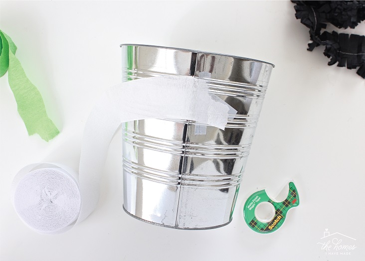 Start by attaching the end of a roll of white crepe streamers to your bucket with tape.