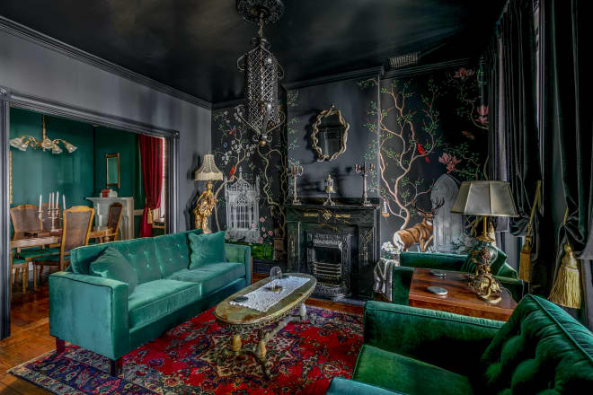 There are dramatically dark wall colors, a green velvet couch and matching chairs, an onyx coffee table, and a huge living room mural. READ MORE...