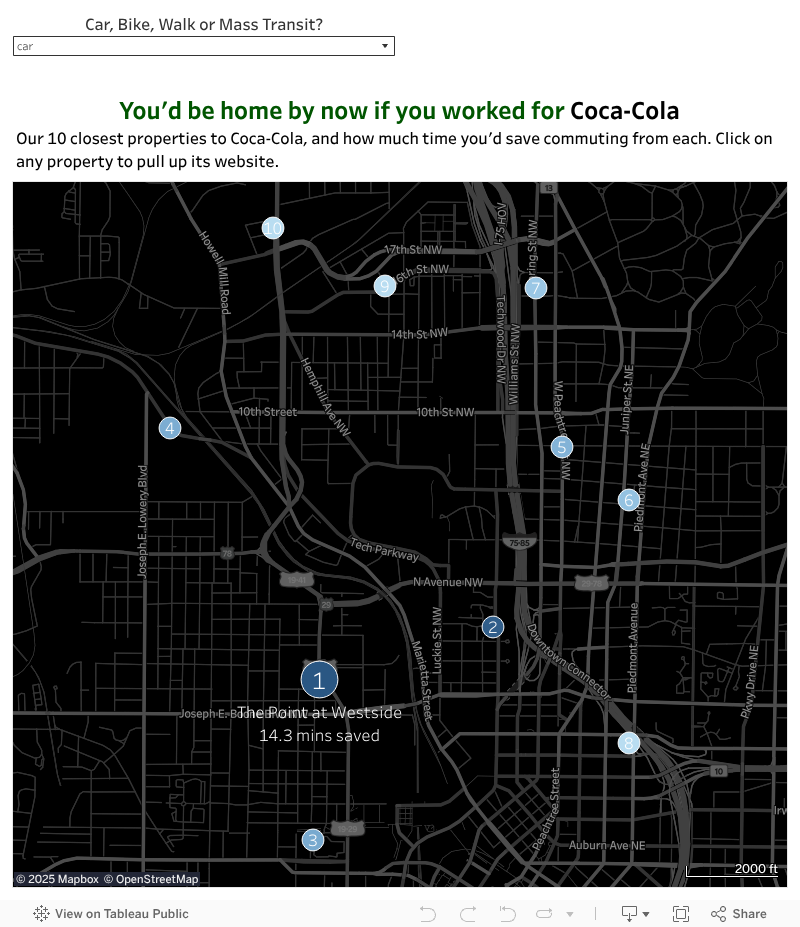 The closest property overall to Coke HQ is The Point at Westside, just under two minutes away by car based on an ideal commute time over the course of a day. That's a savings of 14 minutes compared to the average best daylong travel time for all Coke workers at a speed of 48 m.p.h. without congestion. Even at rush hour, the automotive commute from The Point at Westside is just three minutes compared to a full 32 minutes on average for all employees at a crawl of just 6.8 m.p.h.