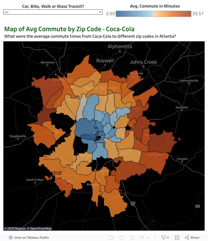 At the most ideal time, the average fastest commute measured for workers at Coca-Cola headquarters runs about 17 minutes driving at the fastest average of just more than 40 miles per hour. If you're coming from just inside the Perimeter, the ideal best case commute is about 15 minutes to Coke HQ. For employees traveling from far-flung suburbs like Marietta, Stonecrest or Forest Park, the optimal commute time can be up to a half-hour.